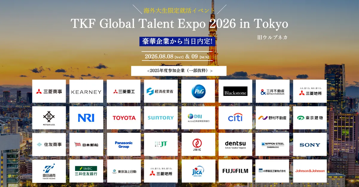 2026年8月、東京ビッグサイトにて、海外大学に在籍する日本人学生向けの就活イベント「TKF Global Talent Expo 2026」が開催されることが決定しました。このイベントは、従来「ウルプネカ Global in Tokyo Summer」として知られていたもので、より多くの学生や企業に対応できるよう名称と内容が刷新されました。主催者である株式会社TKF Projectは、東京の中央区に本社を構えています。