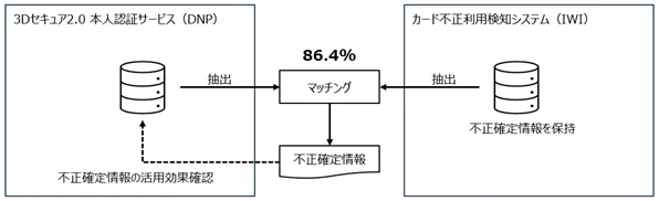 DNPが提供する「3Dセキュア2.0 本人認証サービス」とIWIの「カード不正利用検知システム」とは、データの構成や保有情報が大きく異なるため、以前は不正取引情報の共有が難しい状況でした。しかし、両社は今実証実験において、取引データの分析と照合を実施し、1対1でユニークにマッチングできるかを確認しました。その結果、86.4%の取引でマッチングに成功しました。