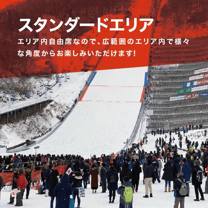 スキージャンプの試合はただ見るだけではありません。会場には、DJやMCが活躍するエンターテインメントゾーンが設けられ、会場全体が一体となって大いに盛り上がります。また、選手の演技を真正面で観られるプレミアムゾーンや、臨場感満点のエキサイティングゾーンが設けられており、観戦の楽しみが広がります。
