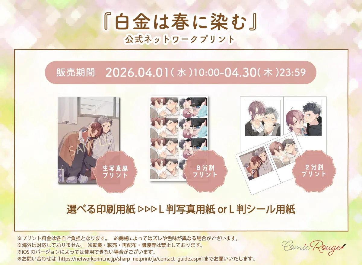 コミックレーベル「コミックRouge」からお届けする青春ピュアラブBL『白金は春に染む』の最新情報をご紹介します。本作は、拗らせ執着モテ男子・銀と一途な純情男子・桃の関係を描いた物語で、多くのファンから支持を受けています。そして、2026年4月1日(水)から30日(木)までの期間限定で、公式ネップリにおいて特別なプリントグッズが販売されます!