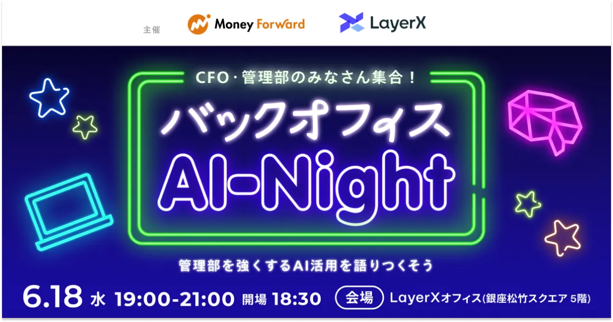 株式会社LayerXが主催するイベント「バックオフィスAI-Night」が、2025年6月18日(水)に東京都中央区で開催されます。特にスタートアップやベンチャー企業のCFO、管理部門に属する方々を対象としており、参加は無料です。