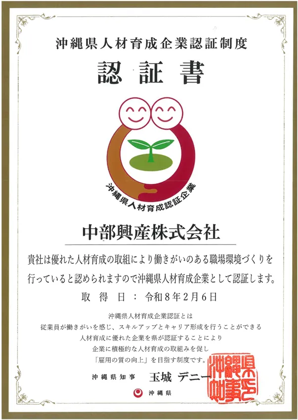 中部興産が沖縄県人材育成企業認証を取得