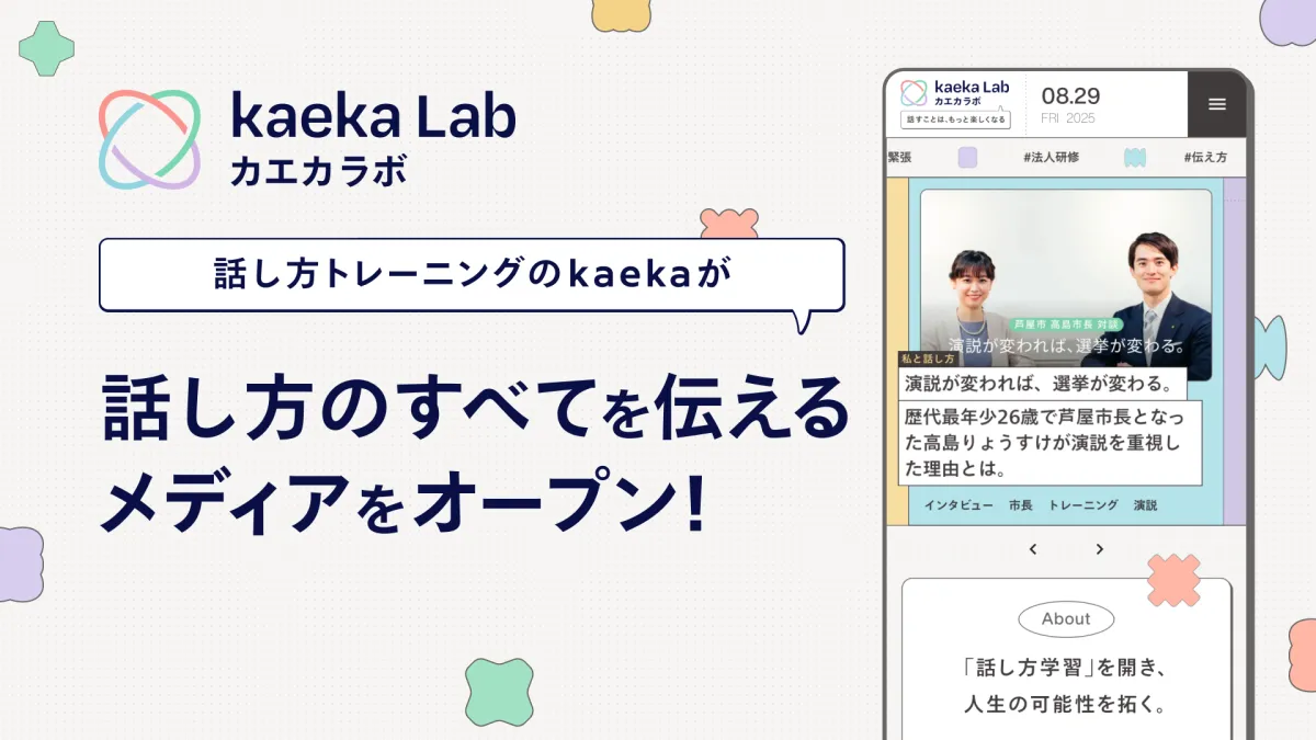 株式会社カエカは、創業以来、経営者や政治家を含む幅広い分野で話し方のトレーニングを提供してきました。今後も『kaeka Lab』を通じて、さらなる知見の共有と話し方の重要性の普及に努めてまいります。