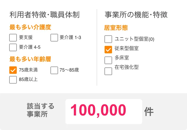 利用者の要介護度やケアの必要性を基に、専門的な条件で絞り込みすることが可能です。たとえば、医療ケアの対応可否や職員体制など、これまで一つずつ確認していた条件を簡単に指定し、該当する事業所を瞬時にリスト化します。これにより、業務の効率が飛躍的に向上します。