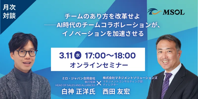 このセミナーでは、ミロ・ジャパン合同会社の白神正洋氏を招き、MSOLのディレクター西田友宏との対談形式で進められます。この対談は単なるツールとトレンド紹介では終わらず、「AI×チームコラボレーションの可能性」と「人が担うマネジメントの価値」という2つの視点から、チームワークの新たな形を探ります。
