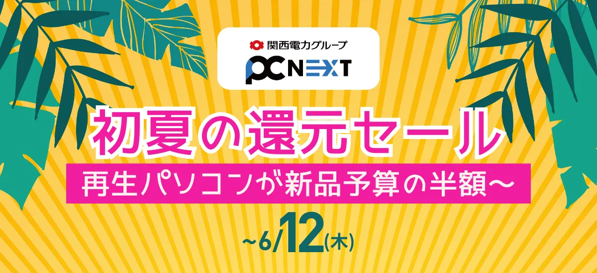 再生パソコンをお得に手に入れるチャンスがやってきました。関西電力グループの株式会社ポンデテックが運営する「PC next」は、2025年6月5日(木)から12日(木)までの期間、全パソコンを対象とした「初夏の還元セール」を開催します。このセールでは、50,000円(税込)以上の購入で最大5,000円の割引が自動的に適用され、お得に再生パソコンを手に入れることができます。