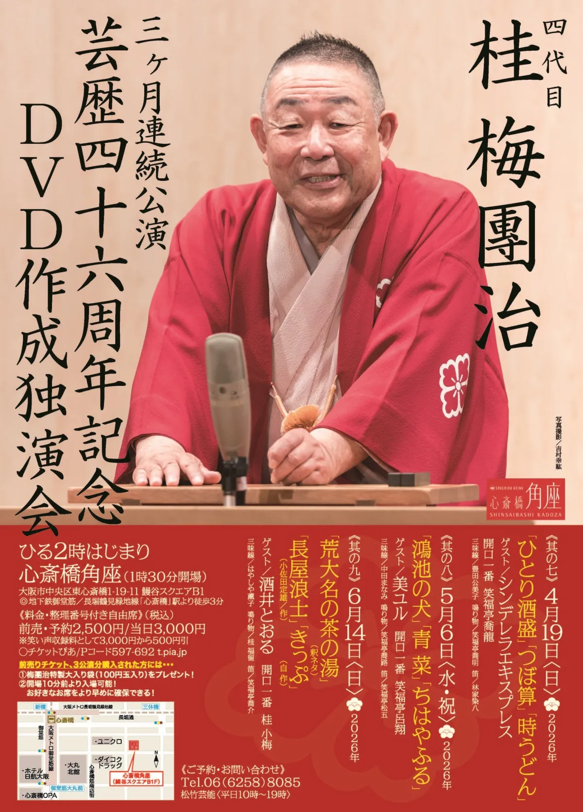 四代目桂梅團治が、今年も「心斎橋角座」にて3ヶ月間にわたる独演会を実施します。このイベントは、彼の芸歴46周年を記念するもので、昨年に引き続き「DVD作成独演会」として展開されます。4月から6月の間に毎月3席ずつの高座が披露される予定です。