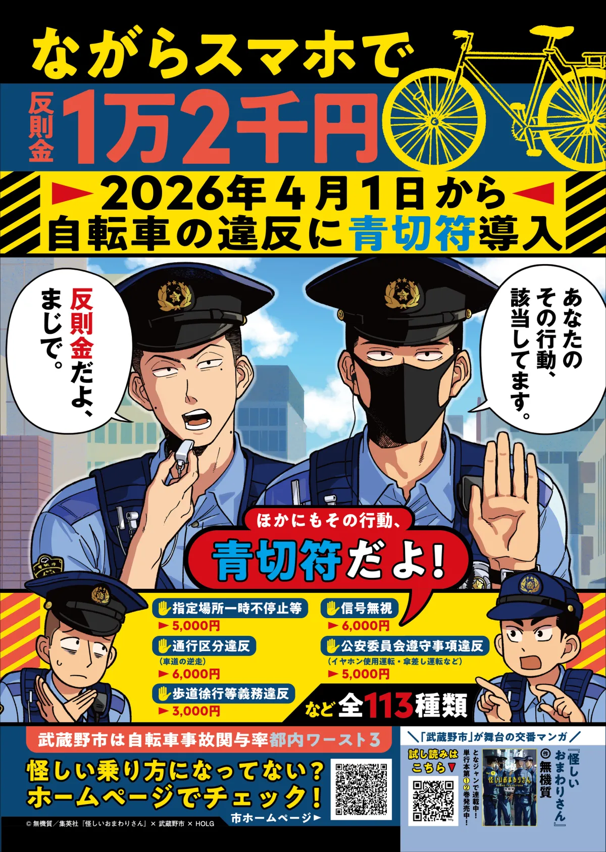 令和8年3月、東京都武蔵野市は、株式会社集英社と共に漫画『怪しいおまわりさん』をテーマにした交通安全PRポスターを制作しました。このポスターは、令和8年4月1日から導入される自転車の交通反則通告制度に関連して、自転車の安全な利用を呼びかけるものです。