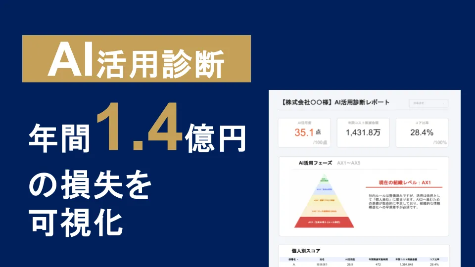 日本の多くの企業では、AI導入が進んではいるものの、実際の業務効率や生産性向上には結びついていないのが現状です。この問題を解決するために、AnataAIの『AI活用診断』は組織が抱える盲点を浮き彫りにします。ある企業の事例では、AIを十分に活用しないことで年間約1.4億円の損失が発生していることが明らかになりました。