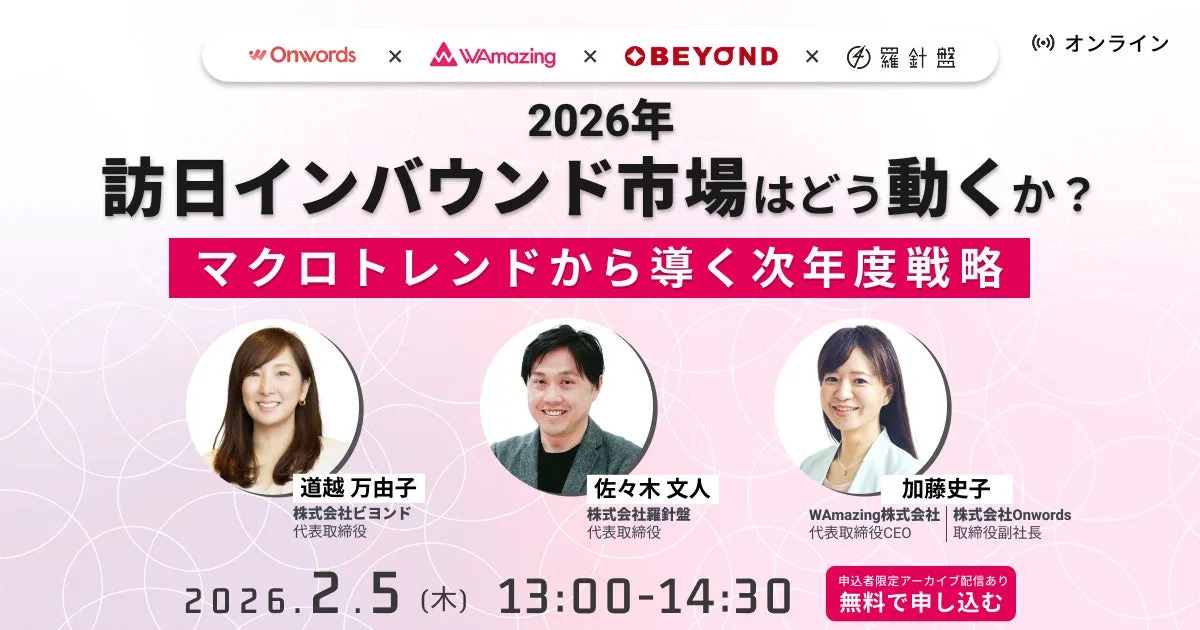 2026年2月5日(木)、オンラインにてインバウンドマーケティングの最前線を行く企業の代表が集まり、2026年の市場展望と成長戦略について考察するウェビナーが開催されます。本ウェビナーは、株式会社OnwordsとWAmazing、それに株式会社ビヨンド、株式会社羅針盤の共催により行われます。参加費は無料ですが事前登録が必要です。