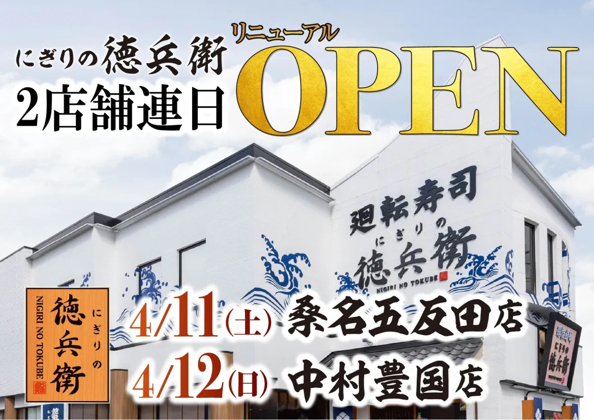 2026年4月11日(土)に三重県桑名市の「にぎりの徳兵衛 桑名五反田店」、そして翌日の4月12日(日)には愛知県名古屋市の「にぎりの徳兵衛 中村豊国店」がリニューアルオープンします。これにより、両店舗は最新の設備で、より快適な食事体験を提供することが期待されています。