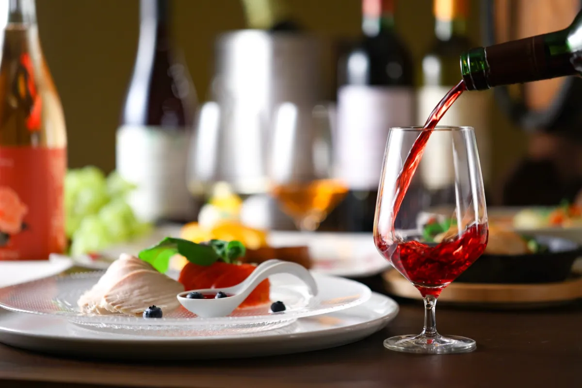 ホテル新光では、ワインと料理のペアリングにも力を入れています。例えば、「ヴァンムスー甲州」はサーモンとクリームチーズのサラダと並び、酸味がワインの特長を引き立てながら、料理の旨みを倍増させます。また、「フォックスヴィレッジ甲州ドライ」は、水炊きと組み合わせることで、山梨の食材同士の相性の良さを実感できます。さらに、かぼちゃとキノコのミートソースグラタンには「YOAKENO 天王原北杜の雫」がふさわしいという提案も特徴的です。