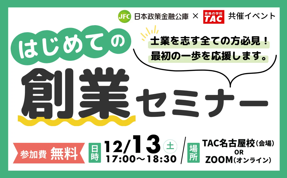 2025年12月13日(土)、TAC株式会社と日本政策金融公庫が共催する創業セミナーが名古屋校及びオンラインで開催されることが決定しました。このセミナーは、士業資格の取得を評価し、独立開業を目指している方々に向けて、実際に必要な知識とノウハウを学ぶ絶好の機会です。