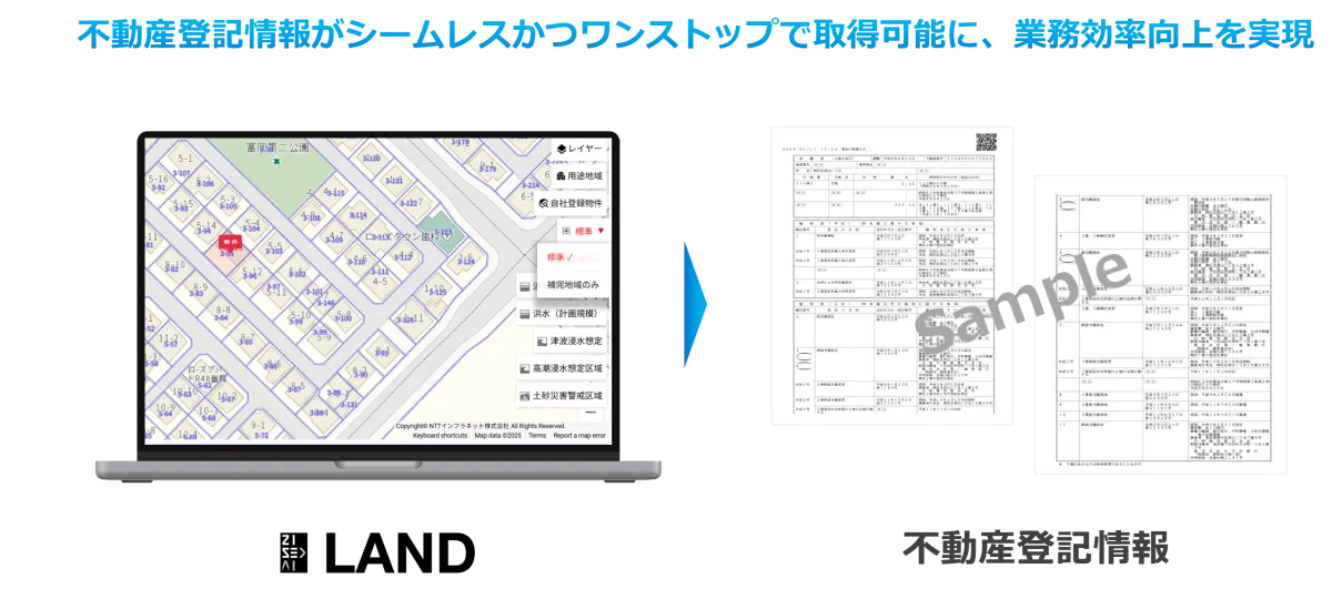 さらに、取得した情報はLANDシステム内に直接保存できるため、社内共有の手間を最小限に抑えることができます。こののち、画面の切り替えや資料管理が不要になるため、大幅な業務の効率化が期待されます。加えて、物件情報と地番情報の連携、不動産登記情報の取得がワンストップで完了することで、複数のツールを利用する必要がなくなり、最新で正確な情報を一元管理できるようになります。
