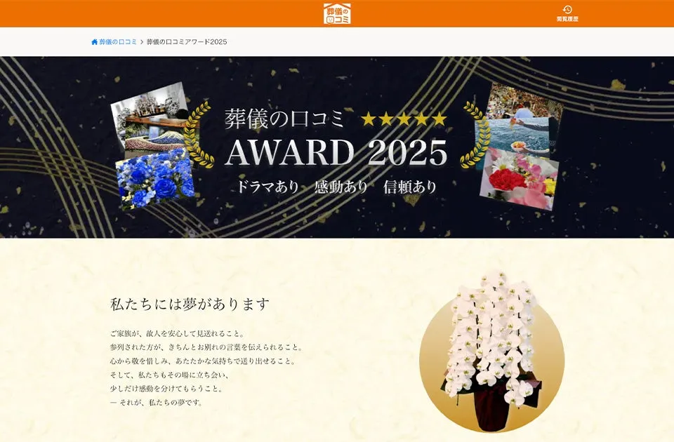 「葬儀の口コミアワード」は、葬儀社の取り組みを広く知ってもらうことを目的とした年に一度の表彰です。本アワードは、評価・受注データを駆使し、AI分析をもとに選ばれます。特に地元密着賞は、地域の風習や慣習を理解し、地元から高く支持された葬儀社に贈られます。一方、明朗価格賞は、プランやオプション内容を明確に提示し、見積もりと請求金額の差が少ない葬儀社に贈られるものです。
