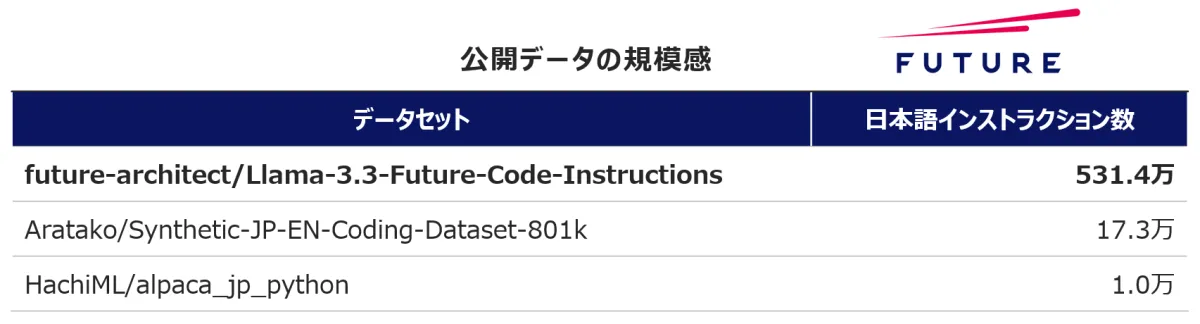 フューチャーは、2024年10月から経済産業省とNEDOが実施する国内生成AIの開発力強化プロジェクト「GENIAC」に採択され、日本語とソフトウェア開発に特化した基盤モデルの研究開発に取り組んでいます。今回公開されたデータは、このプロジェクトの研究成果によって自動生成されたものです。
