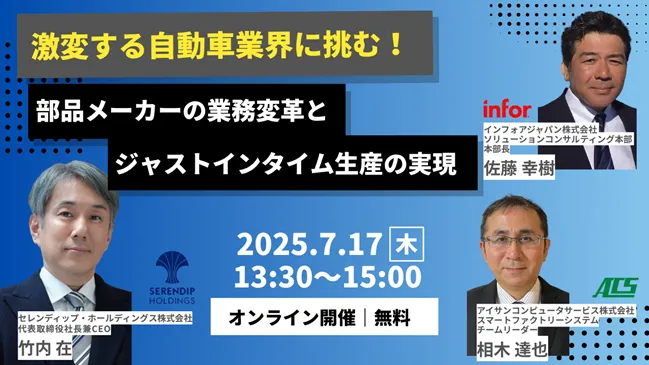 セレンディップ・ホールディングス株式会社(名古屋市中区)は、2025年7月17日にインフォアジャパン株式会社主催の「激変する自動車業界に挑む!部品メーカーの業務変革とジャストインタイム生産の実現」という無料オンラインセミナーを開催することをお知らせします。