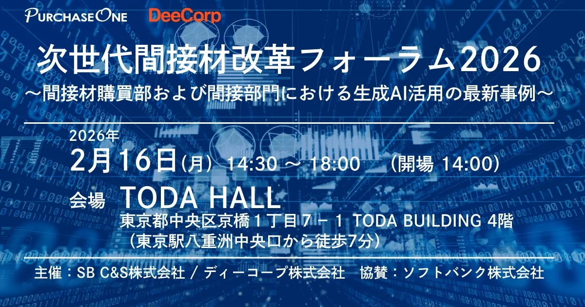 企業の競争力を高めるためには、調達・購買機能の重要性が増しています。その中でも特に間接材購買の改革に取り組むことが、業種や業態を問わず必須の課題となっています。この度、2026年2月16日にSB C&S株式会社とディーコープ株式会社が共同で「次世代間接材改革フォーラム2026」を開催します。このフォーラムでは、間接材購買部門や関連部署の業務改革をテーマに、生成AIの活用に関する最新の情報や実践的なアプローチを紹介します。