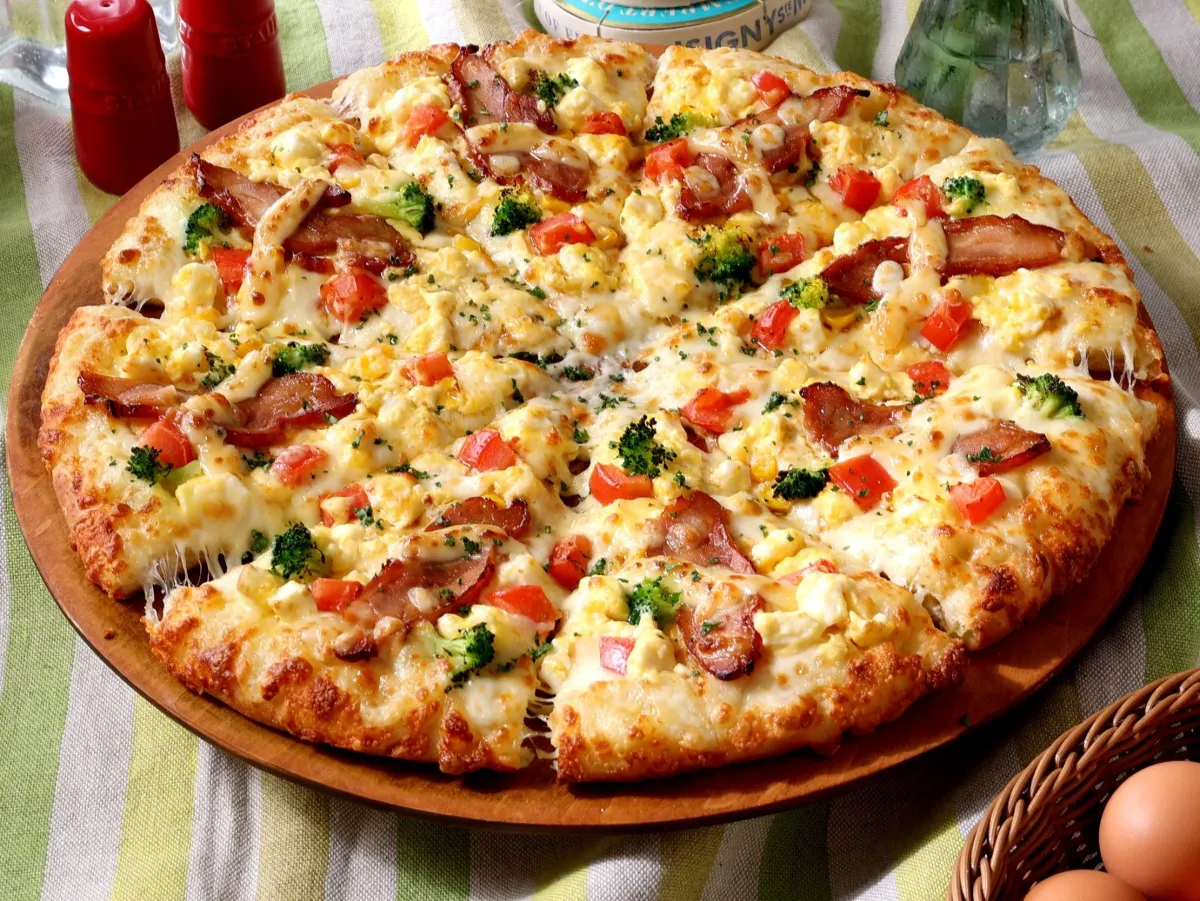 オーブンで軽く焼き色をつけることで、香ばしさが増してやさしい旨味が口の中で広がります。特製の甘辛いテリヤキソースが絡んだジューシーなチキンが、卵のクリーミーさと絶妙に絡むことで、まろやかさと深みのある味わいが楽しめます。さらに、新鮮なブロッコリーやダイストマト、コーンが加わり、見た目にも楽しいアクセントが添えられています。飽きることなく味わえる一枚に仕上がっています。