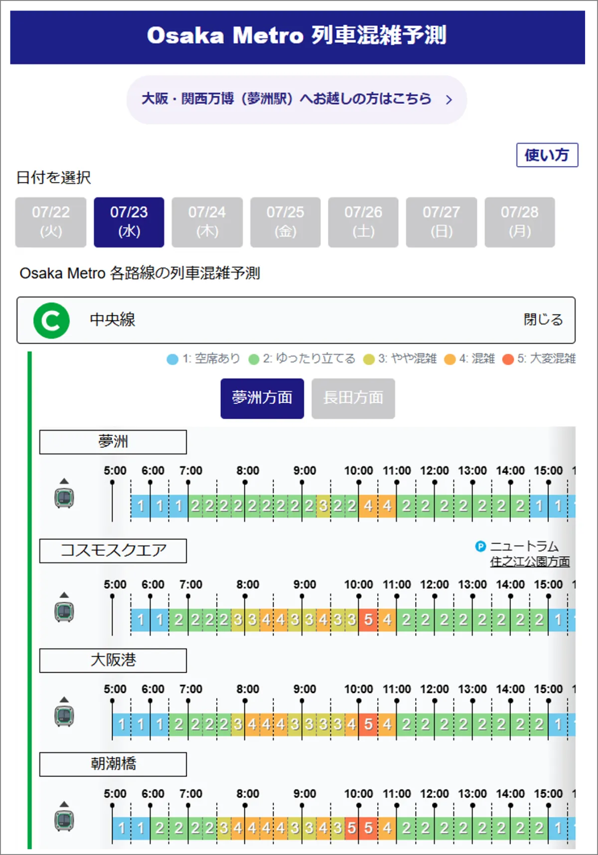 この混雑予測サービスは、Osaka Metroの公式スマホアプリ「e METRO」と公式ウェブサイトを通じて提供されます。具体的には、混雑度を5段階で表示し、利用者は自分の移動予定に合わせて最適な時間を選ぶことができます。表示の例として、1が「空席あり」、5が「大変混雑」といった具合に、視覚的に理解しやすい形式で提供されます。
