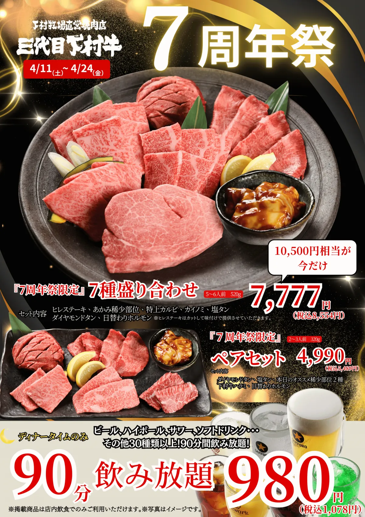 愛知県大府市にある「下村牧場直営焼肉店三代目下村牛」が、開店7周年を迎えることを記念して、特別な「7周年祭」を開催します。このお祭りは、2026年4月11日から4月24日までの14日間にわたって行われ、皆様に日頃の感謝の気持ちを込めて豪華なメニューが用意されています。