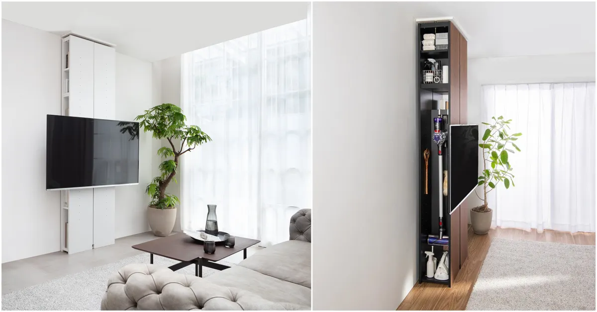 この壁掛けパネルには奥行き16cmと30cmの2タイプが用意されています。奥行き16cmのモデルは本や雑誌、ルーターなどの収納に適しており、30cmのモデルは長尺の掃除用具などを収納できます。また、可動棚板には市販のフックを取り付けることができるため、収納物に応じてカスタマイズ可能です。これにより、テレビ周りをすっきりと整理できます。
