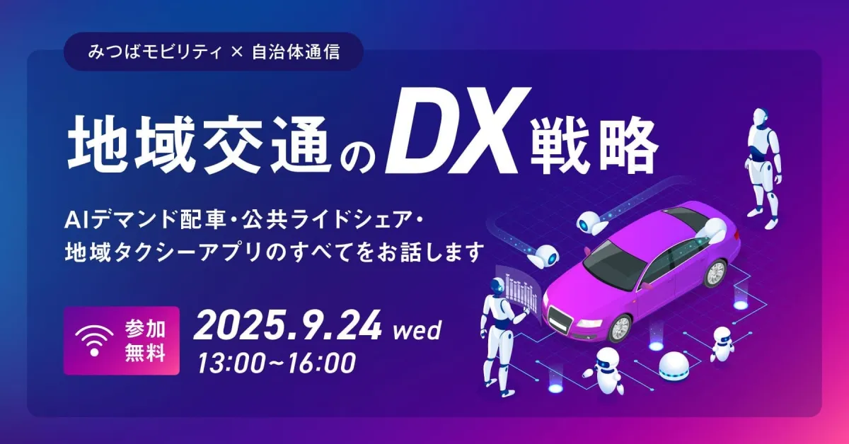 2025年9月24日(水)、みつばモビリティと自治体通信が共催するセミナー「地域交通のDX戦略〜AIデマンド配車・公共ライドシェア・地域タクシーアプリのすべてをお話します〜」が開催されます。このイベントでは、地域交通が抱えるさまざまな課題に対し、AIを活用したデマンド配車や公共ライドシェア、地域タクシーアプリの導入がどのように影響を及ぼすのかを詳しく解説します。