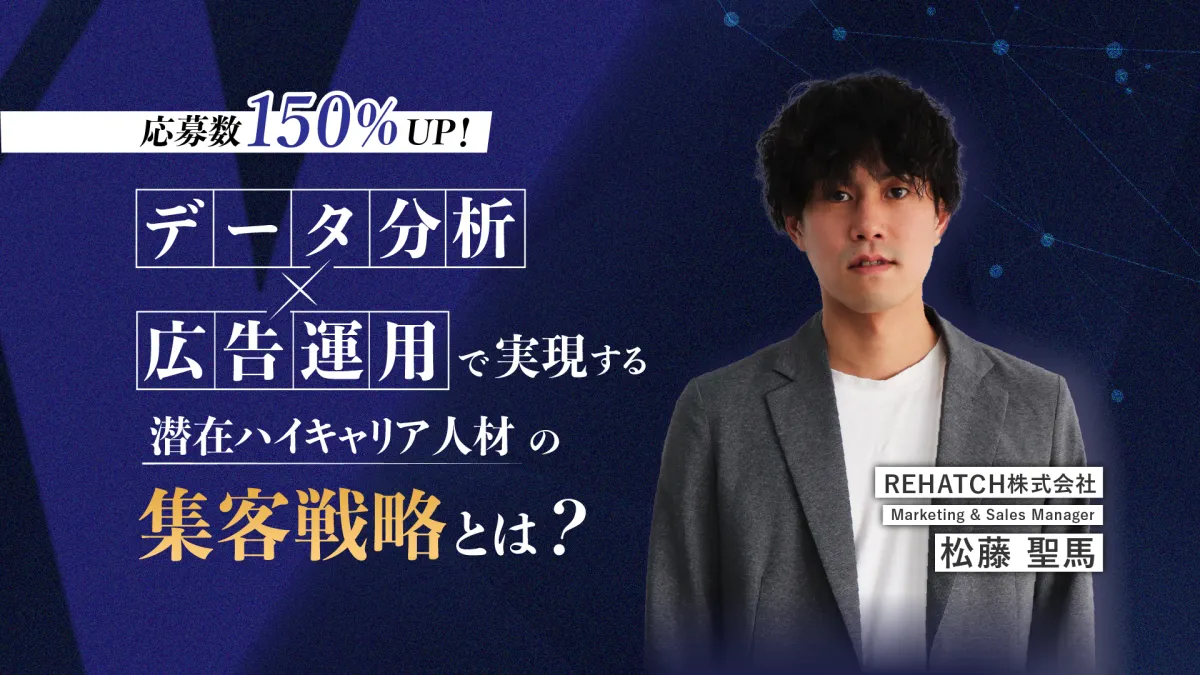 現在、企業環境は急速に変化しており、その中でもハイクラスの人材を獲得することが企業の競争力を左右する重要な要素となっています。特に高年収層の人材獲得は、企業にとってメリットが大きいですが、その一方で適切な戦略を持たないとハードルが高いものです。そこで、REHATCH株式会社が提供するオンラインセミナー「応募数150%UP!データ分析×広告運用で実現する“潜在ハイキャリア人材”の集客戦略」では、これまでの経験をもとにした具体的なノウハウを学ぶことができます。