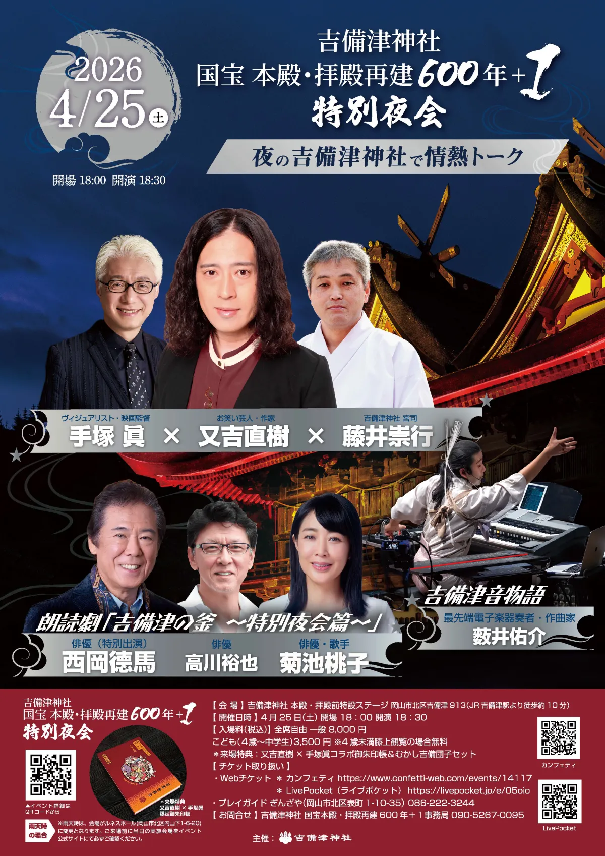岡山市北区に位置する吉備津神社が、特別なイベント「特別夜会」を2026年4月25日に開催します。これは、国宝の本殿・拝殿が再建されてから600年を記念する新たな試みであり、通常は公開されない夜間の境内を開放します。参加者は、夜の神社で独自の体験を通して、文化と歴史の深い魅力を味わうことができます。