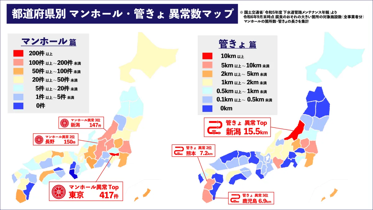 ソニー損保が発表した「都道府県別 マンホール・管きょ異常数マップ」では、異常件数ランキングが示されています。2023年度のデータによると、マンホールの異常数1位は東京都で417件、次いで長野県が150件、新潟県が147件の異常を記録しています。新潟県は管きょの異常距離でもトップで、いずれも地域特有の地盤やインフラの老朽化が影響を与えているとされています。
