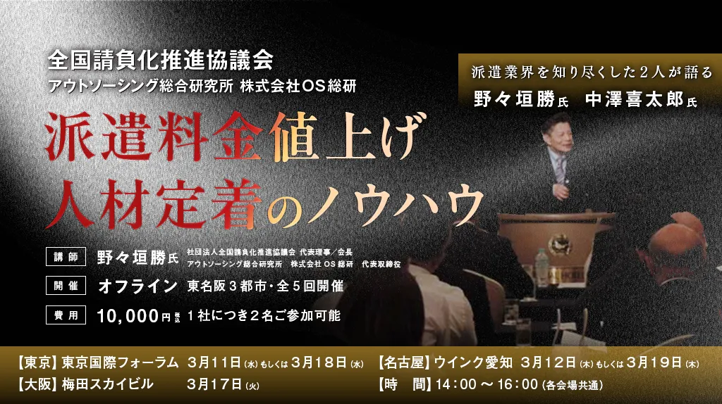 セミナーの講師は、人材派遣業界に豊富な経験を持つ専門家たちです。株式会社OS総研の代表取締役でもある野々垣勝氏は、18年にわたり大手人材ビジネス会社での経営経験を持ち、その知識と経験を活かして多くの派遣会社を支援してきました。また、ブレイン・ラボの中澤喜太郎氏は、数多くの企業での事業戦略や業績管理の経験を有し、特に人材採用と定着率改善において成功を収めています。