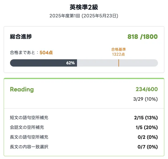 リーディングとリスニングのスコアを、英検の出題形式に沿った「大問」ごとに分解して表示します。例えば、「短文空所補充:10/12 (83%)」「会話内容一致:2/10 (20%)」など、得意・不得意な問題形式を具体的な数値で視覚化し、学習計画を立てる際の指針を提供します。