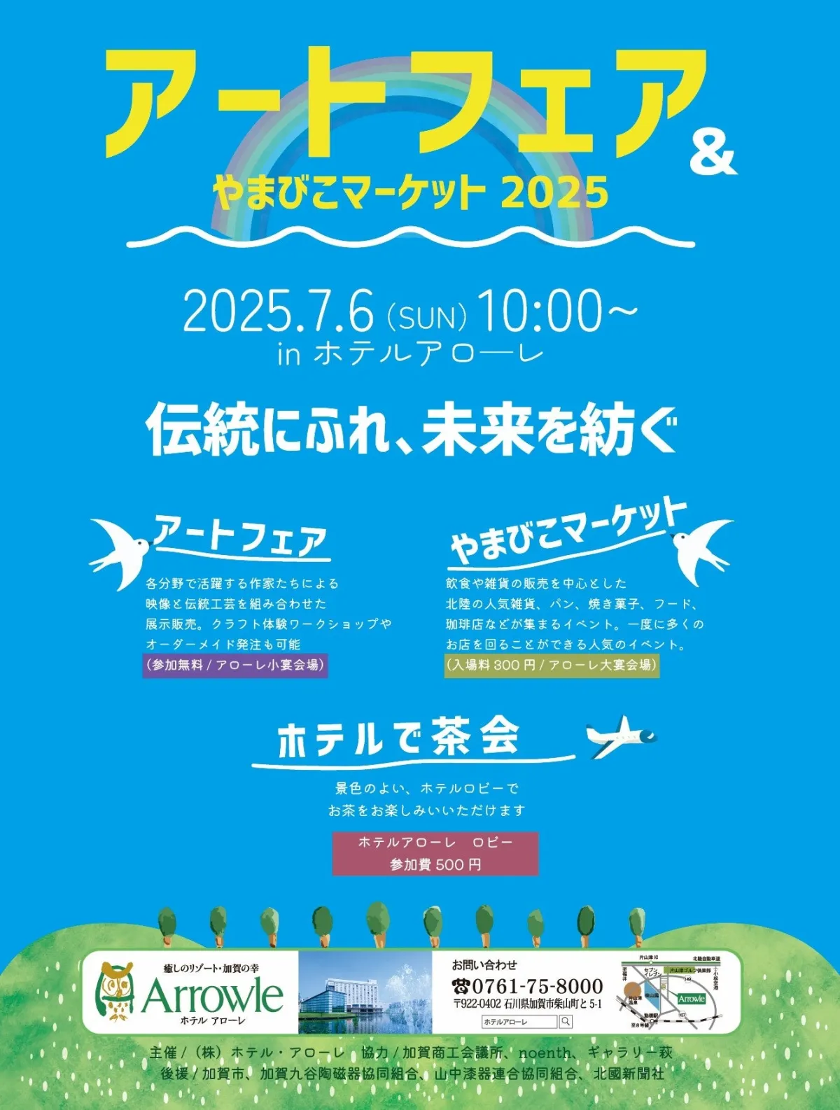 2025年7月6日(日)、石川県加賀市にあるホテルアローレにて、「伝統にふれ、未来を紡ぐ」をテーマにしたビッグイベント「アートフェア&やまびこマーケット2025」が開催されます。この一日限りの特別な機会では、アートやクラフトの楽しさを存分に体験することができます。