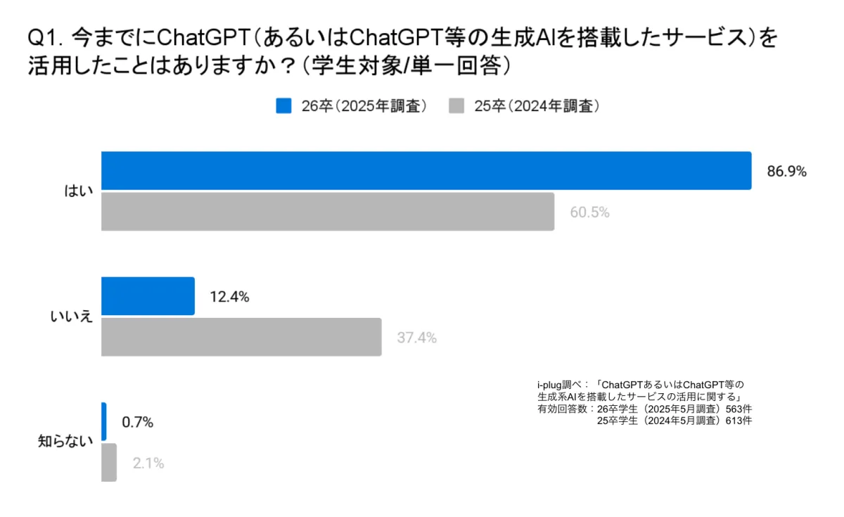 近年、学生の就職活動において、生成AIの利用が顕著に増加しています。株式会社i-plugが新卒オファー型就活サービス「OfferBox」を通じて実施した調査によれば、2026年卒の学生の86.9%がChatGPT等のAIを活用した経験があると回答したとのことです。この数値は、昨年の調査結果よりも26.4ポイント増加しており、学生たちにとってこの技術の利用がますます身近になっていることを示しています。