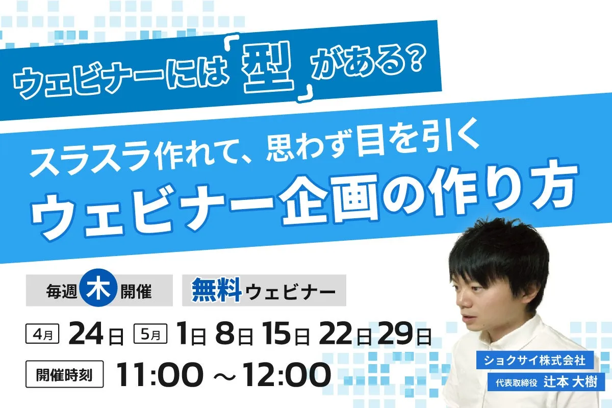 ショクサイ株式会社が主催するウェビナー企画の無料オンラインセミナーが迫っています。今回のウェビナー「ウェビナーには型がある?スラスラ作れて、思わず参加したくなるウェビナー企画の作り方」では、ウェビナーを活用したいすべてのマーケティング担当者を対象に、企画から集客、運営までのノウハウを学ぶことができます。