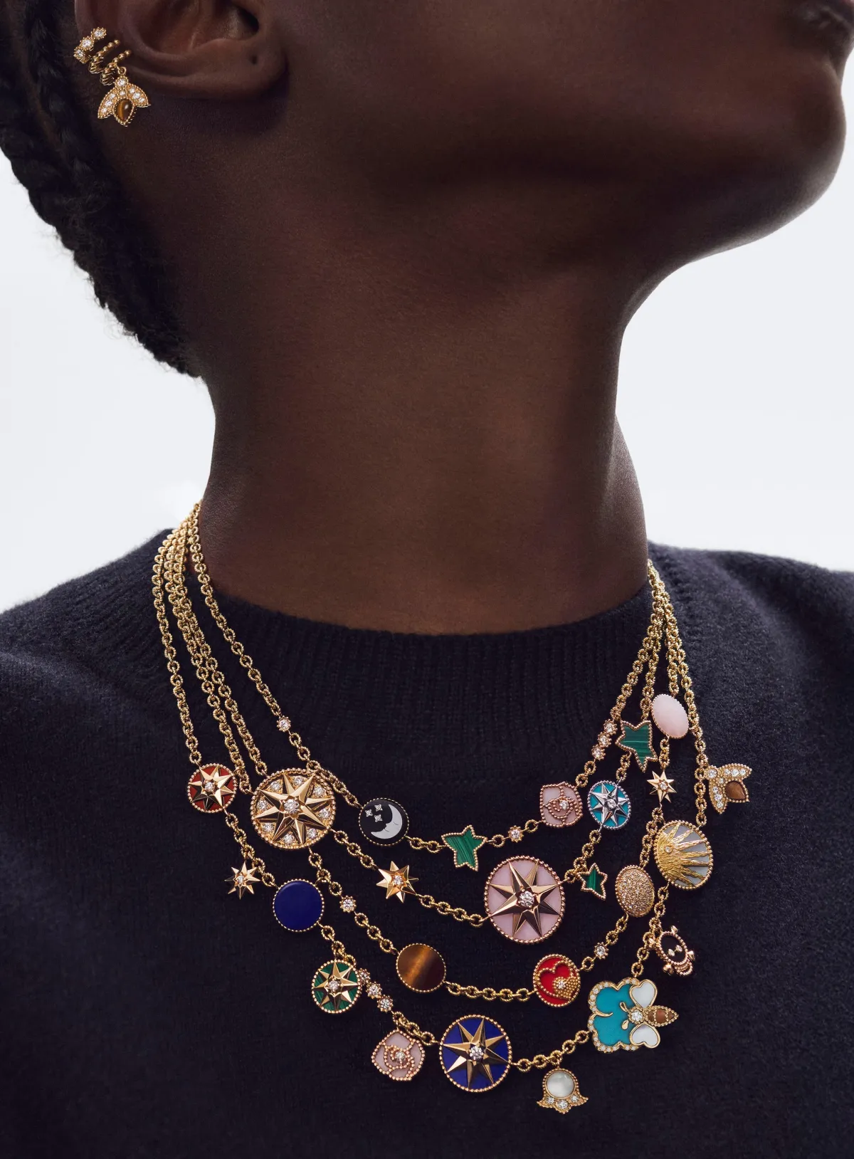 2022年には「ローズ デ ヴァン チャーム」が新たに発表されました。これは、クリスチャン・ディオールの魅力を呼び覚ますお守り的存在としてデザインされ、スズランやバラ、ミツバチといったモチーフが印象的です。また、様々な色や形のストーンが使われており、身に着けることで気持ちを高めてくれるアイテムとなっています。