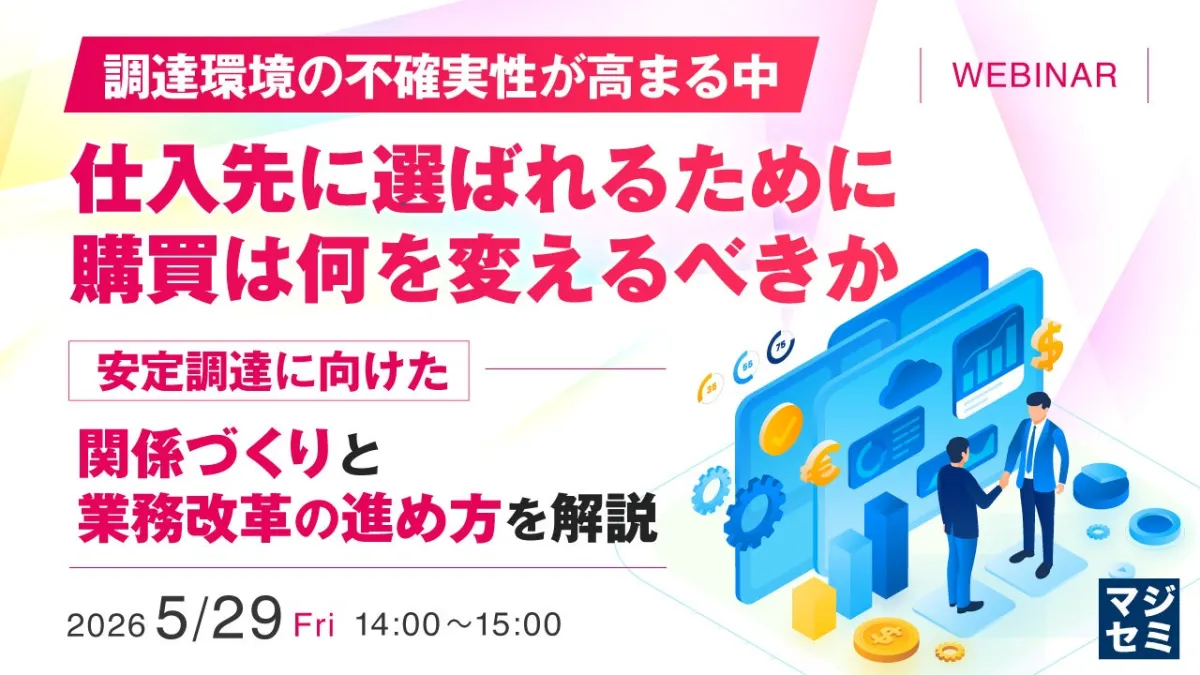 本ウェビナーでは、「仕入先とのパートナーシップをどう再構築するか」というテーマを中心に、安定した調達を実現するための具体的な考え方を解説します。支払いの透明性、正確な発注、迅速な情報伝達、そして計画の予測可能性といった要素から、仕入先にとって魅力的な企業としてどのように調達業務を見直していくべきかを詳しく説明します。