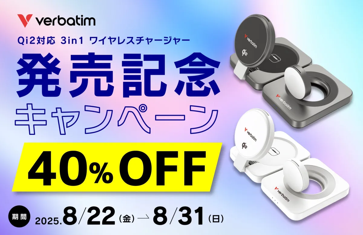新たに登場したVerbatimの3in1ワイヤレスチャージャーが、特別価格で販売されることとなりました。このキャンペーンは、2025年8月22日から8月31日までの期間中、対象商品が全品40%OFFで手に入るチャンスです。これからのモバイルライフをより便利にしてくれる充実した機能を備えています。