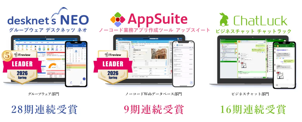 株式会社ネオジャパンが、アイティクラウド株式会社が主催する「ITreview Grid Award 2026 Spring」で、グループウェア『desknet's NEO』、ノーコード業務アプリ作成ツール『AppSuite』、ビジネスチャット『ChatLuck』といった製品で、それぞれ5部門で最高位の「Leader」を受賞しました。