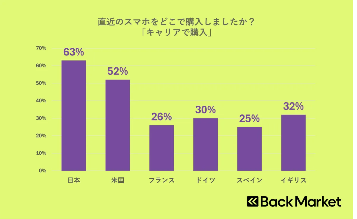 調査によれば、日本国内でスマートフォンをキャリアから購入するケースは63%に達し、これは前年と大きな変化がありません。一方で、欧州諸国ではこの数字が約30%にとどまることが見られ、アメリカと比較しても日本では依然として実店舗での購入傾向が強いことが分かります。具体的には、63%の日本の消費者が実店舗での購入を選択しており、米国でも62%と高い割合を示しています。これは、日本と米国における消費者が実際に店舗に足を運ぶことを重視している結果と言えるでしょう。
