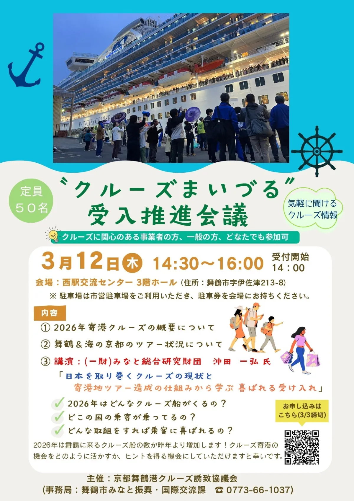 京都舞鶴港クルーズ誘致協議会が、2026年のクルーズ船寄港増加を目指す受入推進会議を開催します。この会議は、令和8年3月12日(木)の午後2時30分から西駅交流センターにて行われ、参加はどなたでも無料でできます。特に、これからクルーズ船の受入に興味がある事業者や一般の方にとって、新たな知識やアイデアを得る絶好の機会となります。