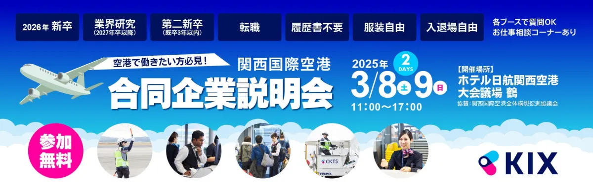 2025年3月8日(土)から9日(日)にかけて、関西国際空港にて合同企業説明会が開催されます。これは、関西エアポート株式会社が主催し、総合人材情報サービスの株式会社アイデムが運営を担当します。このイベントは新卒だけでなく、第二新卒や転職希望者にも門戸が開かれ、多くの求職者が参加できる絶好の機会です。