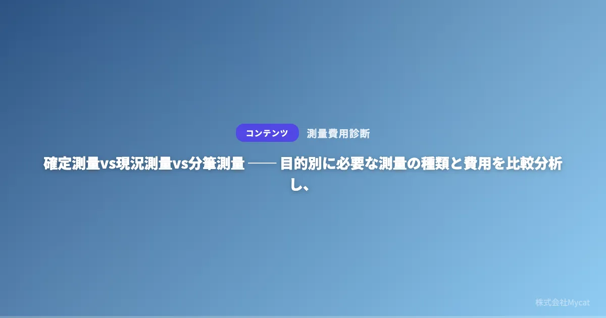 土地測量には目的に応じた様々な種類があり、それぞれに必要な費用があります。正しく目的に合った測量を選ぶことで、スムーズな土地の取引・利用が実現するでしょう。新たに自動判定機能が追加されたMycatの測量費用診断を活用して、あなたに必要な測量を見極めましょう。
