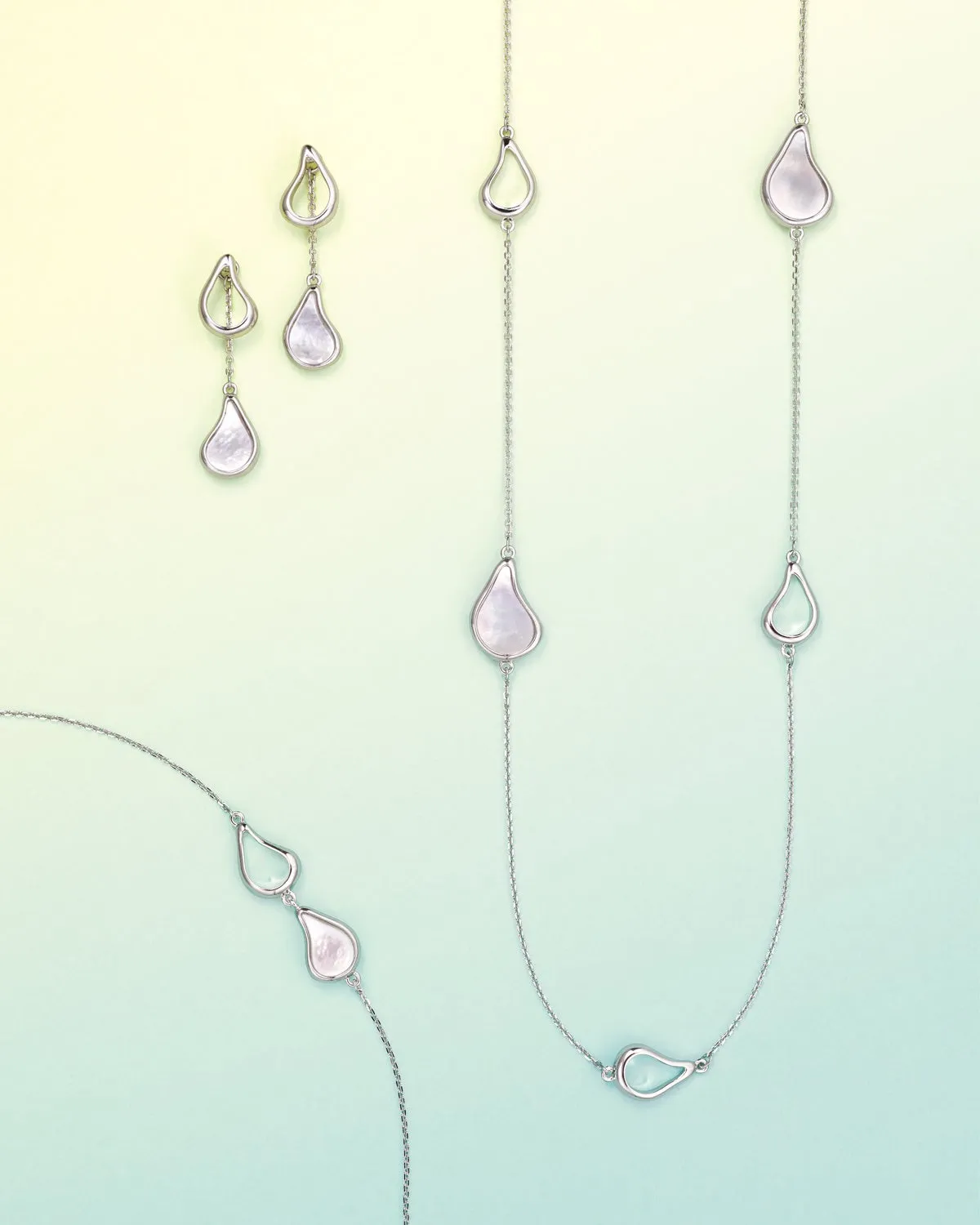 新作はドロップシェイプが特徴で、優しさを感じさせる印象を与えます。そのデザインには両面に白蝶貝が施されたシェルドロップがあしらわれており、シンプルながら存在感が抜群です。特に注目すべきはオープンドロップのデザインで、この組み合わせが胸元や手元を上品に演出します。これにより、どんなシーンでも華やかさをプラスすることができます。
