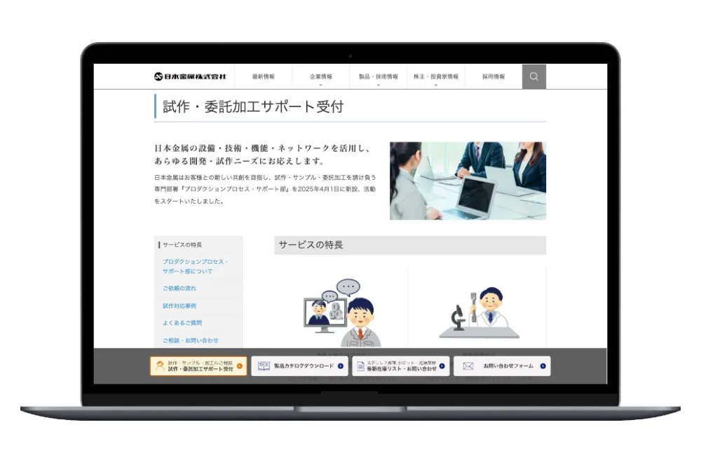 『試作・委託加工サポート受付』の詳細については、2025年4月1日から当社の公式ホームページにて公開しています。お客様の製品開発プロセスのサポートを行い、あらゆるニーズに応じた提案をいたします。お問い合わせはお気軽にどうぞ。