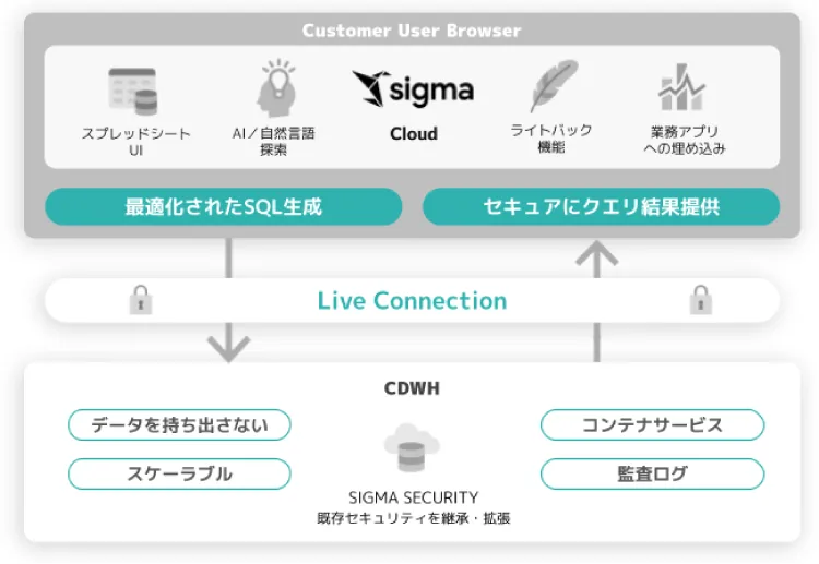 また、Sigmaはデータのガバナンスやセキュリティにも十分配慮されており、クラウドDWHの既存の権限やポリシーを尊重した設計がされています。この構造により、安全性を保ちつつ全社的にデータを活用できる環境を提供します。