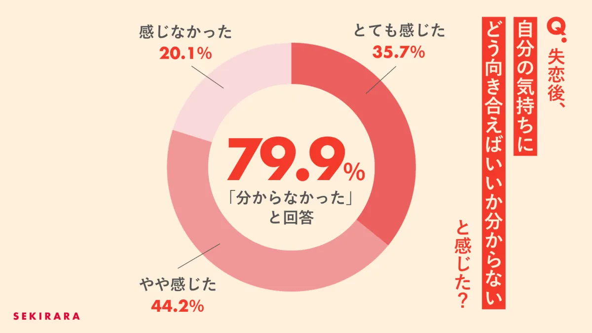 - 79.9%の人が失恋後、どう気持ちと向き合えば良いかわからなかったと回答しています。これこそが失恋の真の課題と言えるでしょう。