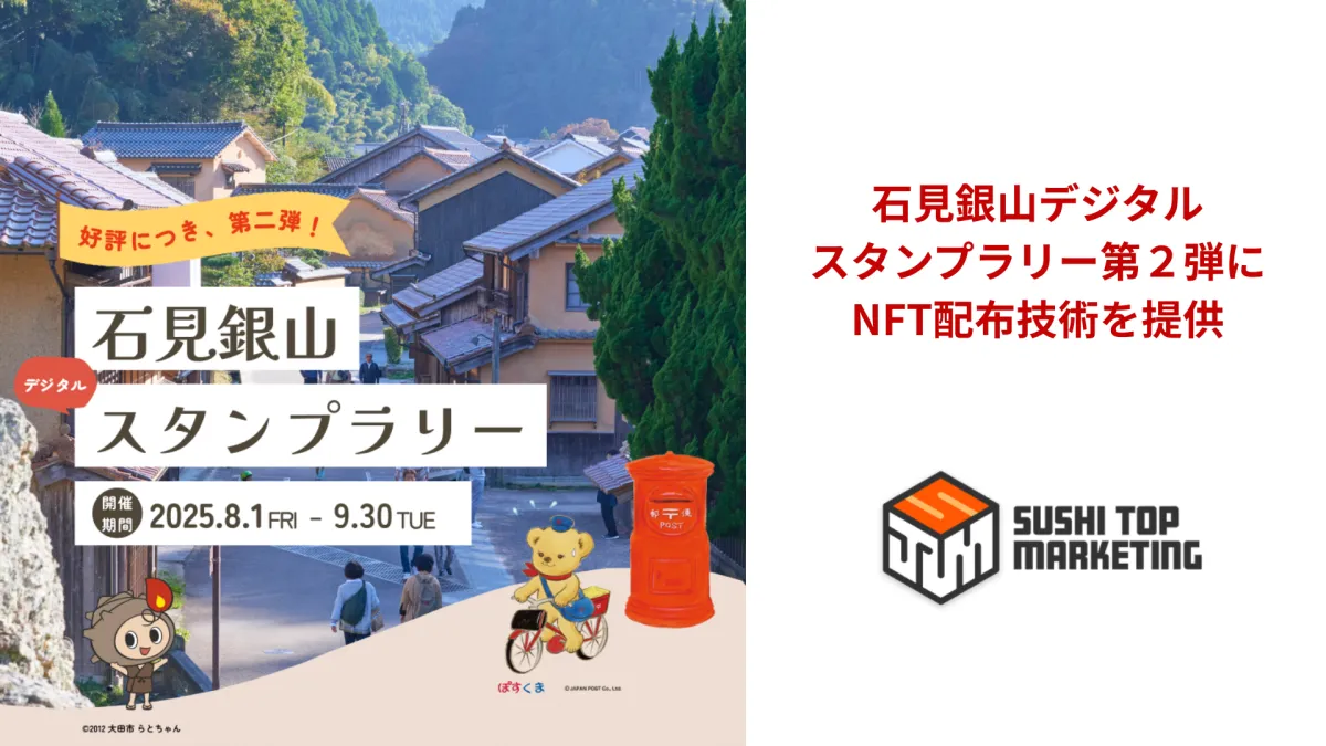 SUSHI TOP MARKETING株式会社は、このプロジェクトに関連して、日本郵便が提供する地域共創NFTプロジェクトに自社のNFT配布技術を提供することを決定しました。このプロジェクトは、観光客がエリアに訪れ、地域との関わりを持つ際に、特別なデジタルスタンプ(NFT)を配布することで、地域経済の活性化を図るものです。