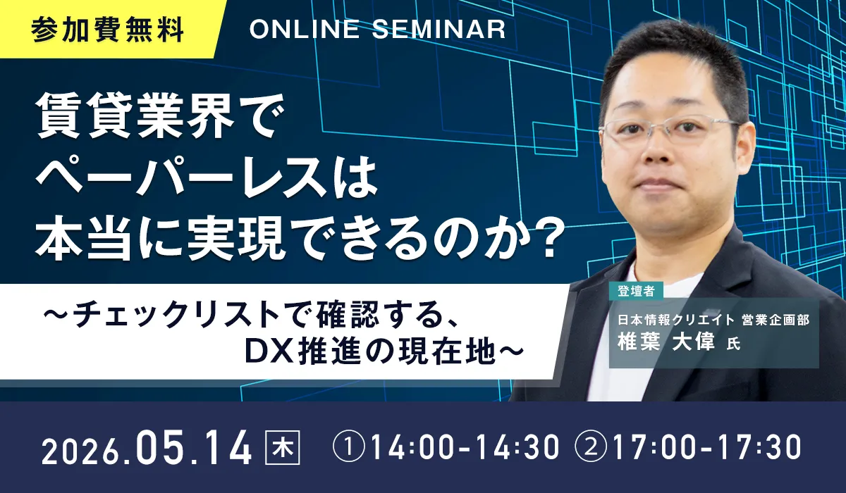 不動産テックを牽引している日本情報クリエイト株式会社は、2026年5月14日(木)に「賃貸業界でペーパーレスは本当に実現できるのか?」という無料のオンラインセミナーを開催します。このウェビナーでは、賃貸業界における紙業務の「見えないコスト」を可視化し、ペーパーレス実現に向けた具体的なアプローチを紹介します。