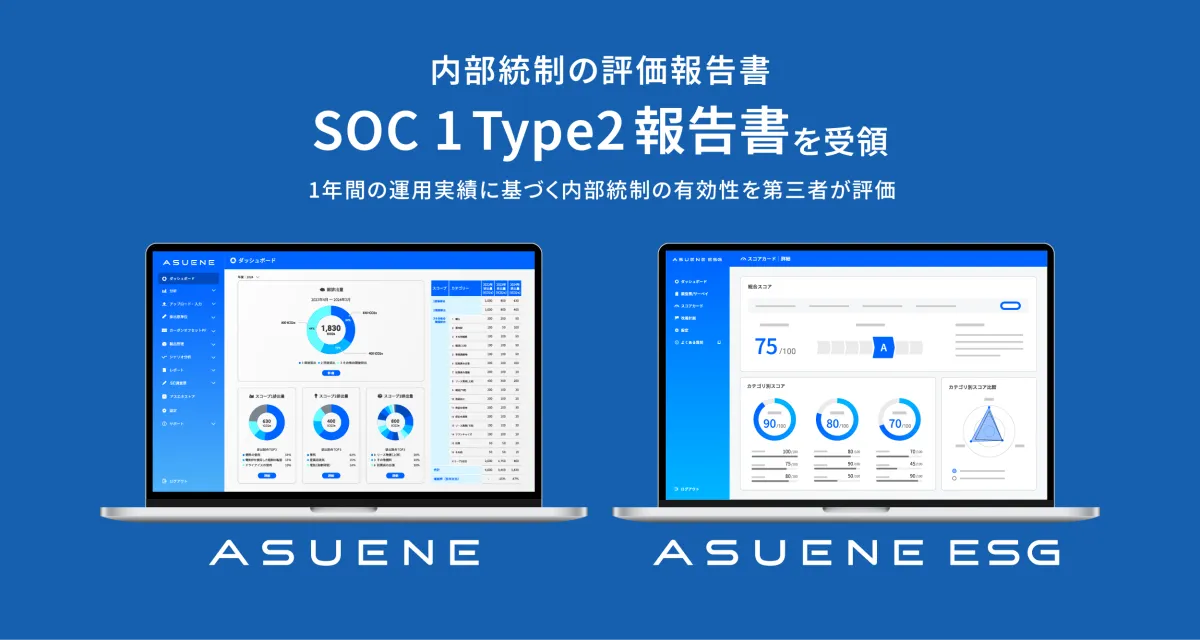 アスエネ株式会社は、CO2排出量見える化・削減を手助けするオンラインサービス「ASUENE」およびESG評価を行う「ASUENE ESG」において、受託企業の内部統制を評価する「SOC 1 Type2報告書」を取得しました。これにより、業務の信頼性向上を目指す姿勢が強調されています。